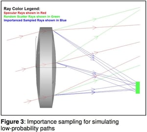 One such variance reduction method implemented in this optical design software is importance sampling. This technique increases sampling in low-probability scattered paths that might otherwise be under-sampled. By using a scatter distribution function to determine probability density and apportion a fraction of the scattered ray flux into a desired direction, importance sampling can dramatically speed up the convergence of the simulation, often by several orders of magnitude.