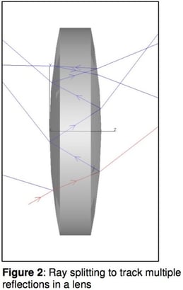 The ray splitting feature in TracePro represents a significant advancement in optical analysis software. This capability allows a parent ray to split into child rays, accounting for reflection, refraction, transmissive and reflective scatter, and absorption. Ray splitting is particularly crucial for efficient sampling of rays reflected from lens surfaces and is indispensable for ghost analysis in complex optical systems.